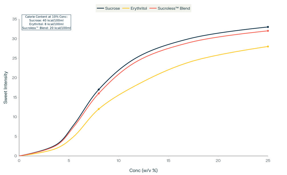 Sweetness growth matches sucrose (1.31), for proportional rises with concentration, unlike high-intensity sweeteners’ flat responses. Calories stay minimal, with near 1:1 potency to sugar, easing reformulations.